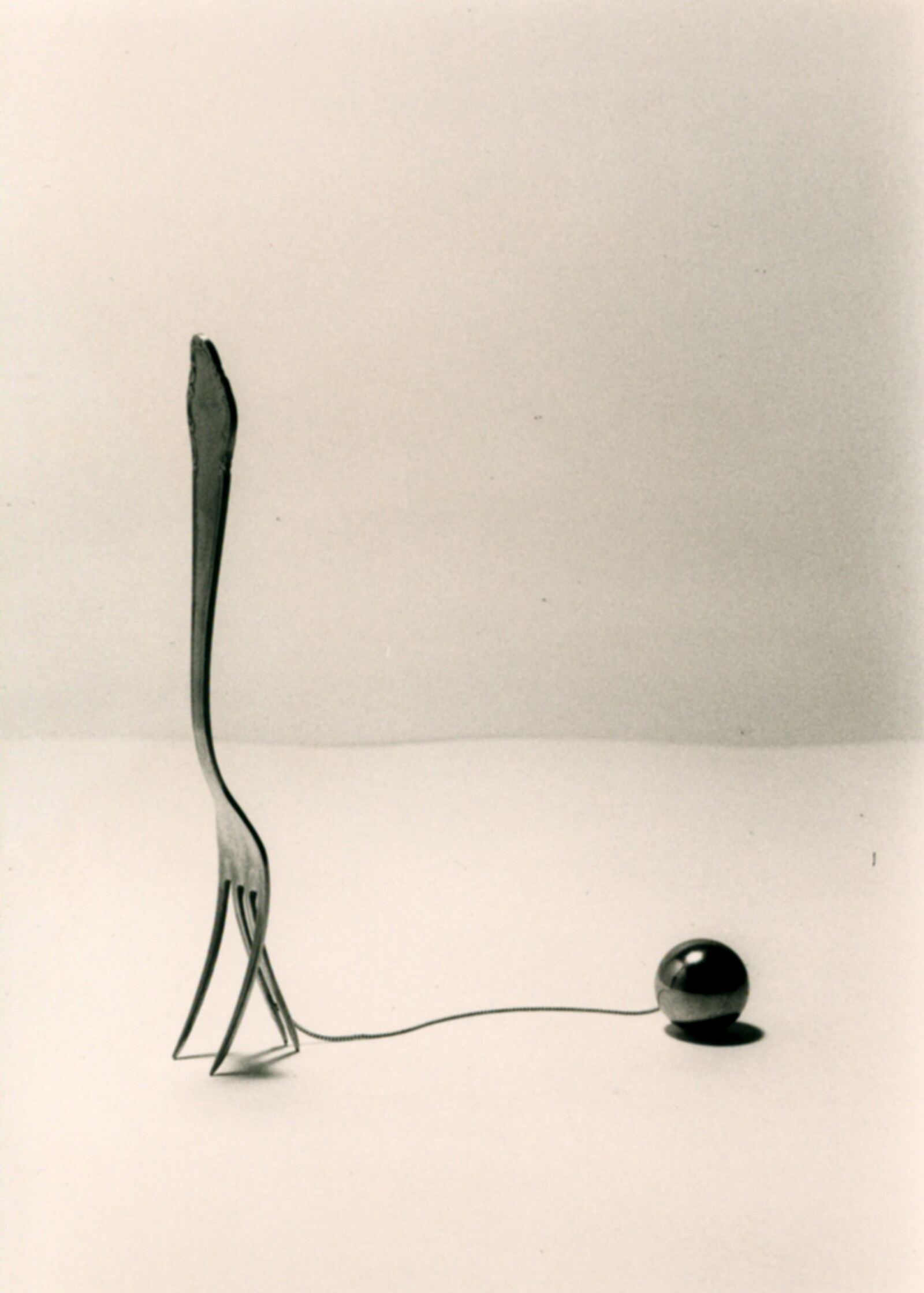 Die gehende Gabel 1983ca. 20 x 4 cmaufrecht stehende (durch entsprechendes Abbiegen zweier Zinken) Küchengabel, gekettet (Silberkettchen) an eine Stahlkugel, ca. 2 cm Ø