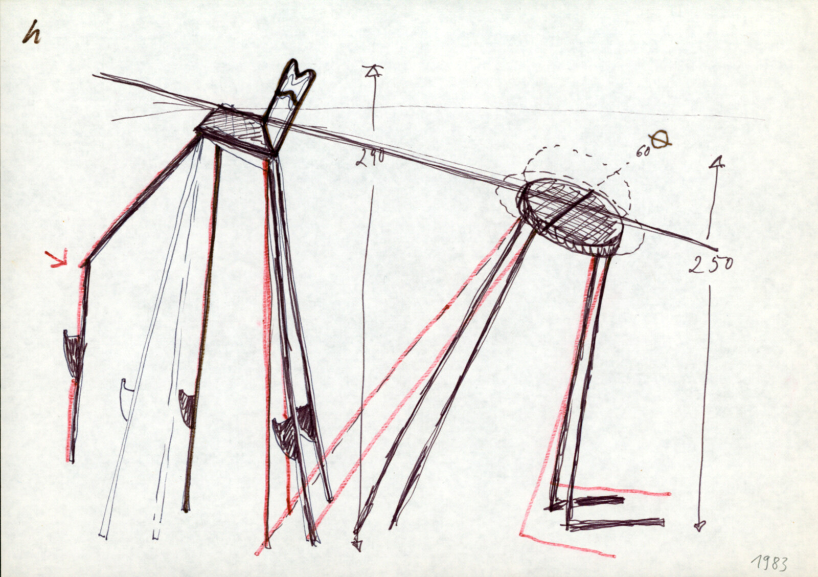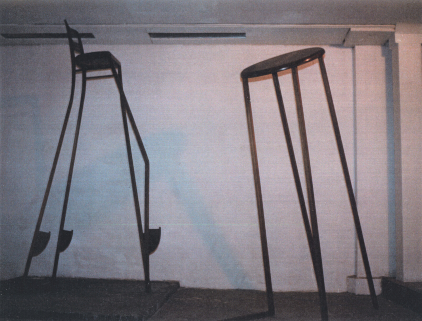 Tisch hoch und Stuhl hoch 1983keine Angabenrundes Holztischchen und gepolsterter Holzstuhl mit bis auf 3 Meter verlängerten Holzbeinen, Tisch mit 2 abgewinkelten Beinen, Stuhl mit 2 hölzernen Stelzentritten