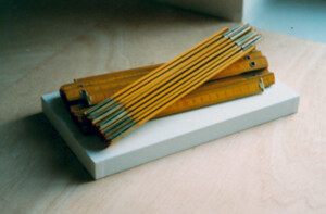 Giraffe (Prototyp) 1996 8 x 26 x 14 cm drei zusammengelegte gelbe Zollstöcke bei- und übereinanderliegend auf dem mit weißem Papier bezogenem Holzbrettchen
