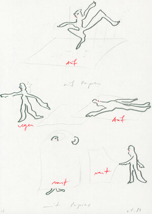 Blatt Papier mit Zeichnungen: auf Papier mit Papier, wegen Papier, trotz Papier 1981 zweiteilige Arbeit: 61 x 86 cm Blei- und Buntstift