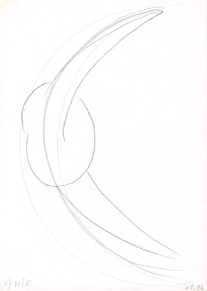 Jedenfalls ist dies ein Pfeil von oben, unten, hinten und vorne und der Wetterhahn des Charlottenburger Schlosses bei Gegen- und Mitwind 1986 29,7 x 21,1 cm Bleistift