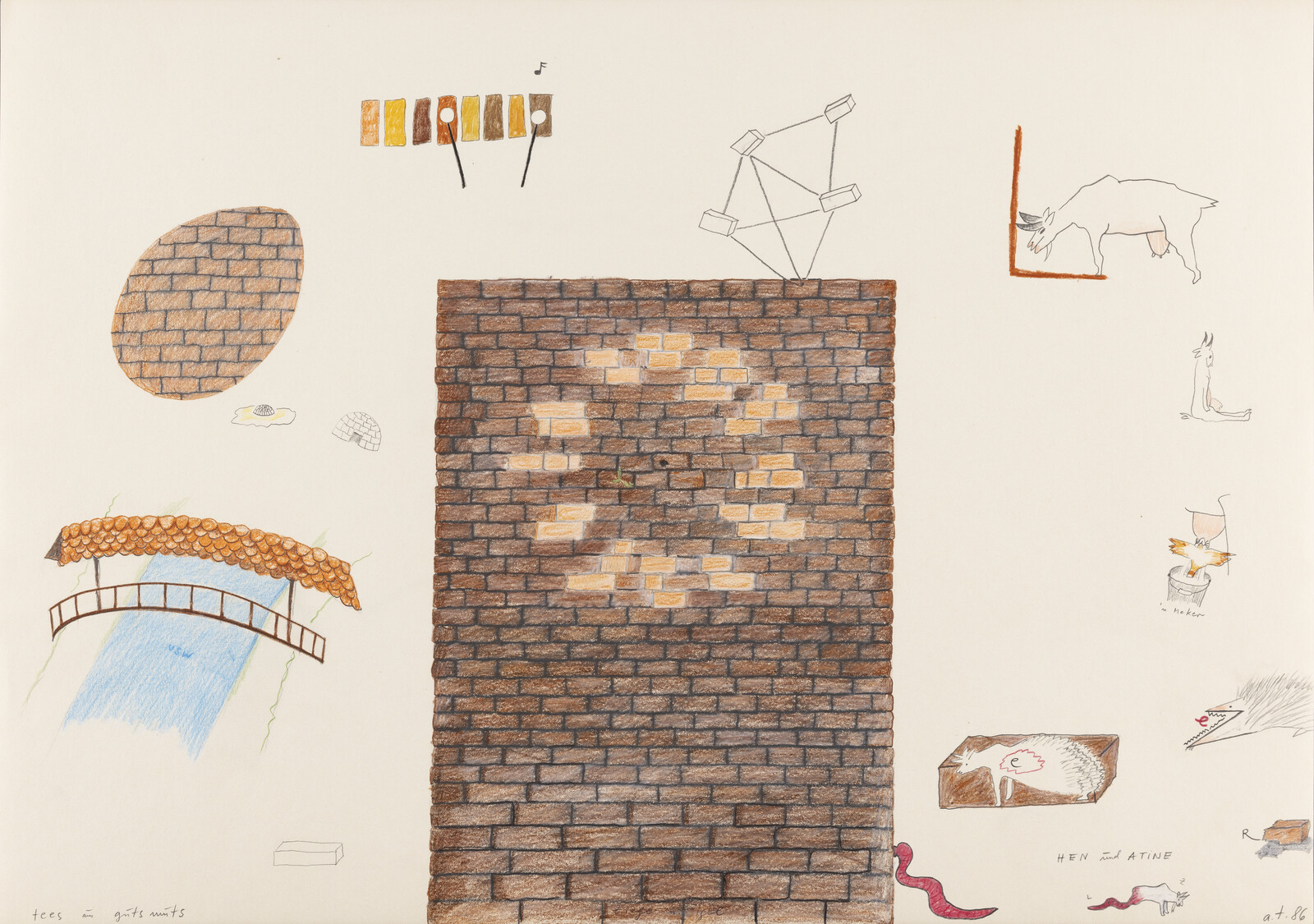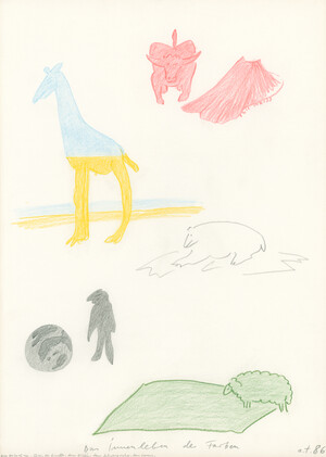 Das Innenleben der Farben. Am Beispiel von: Stier, der Giraffe, dem Eisbär, dem Schwarzseher, dem Lamm 1986 43 x 30,5 cm Blei- und Buntstift