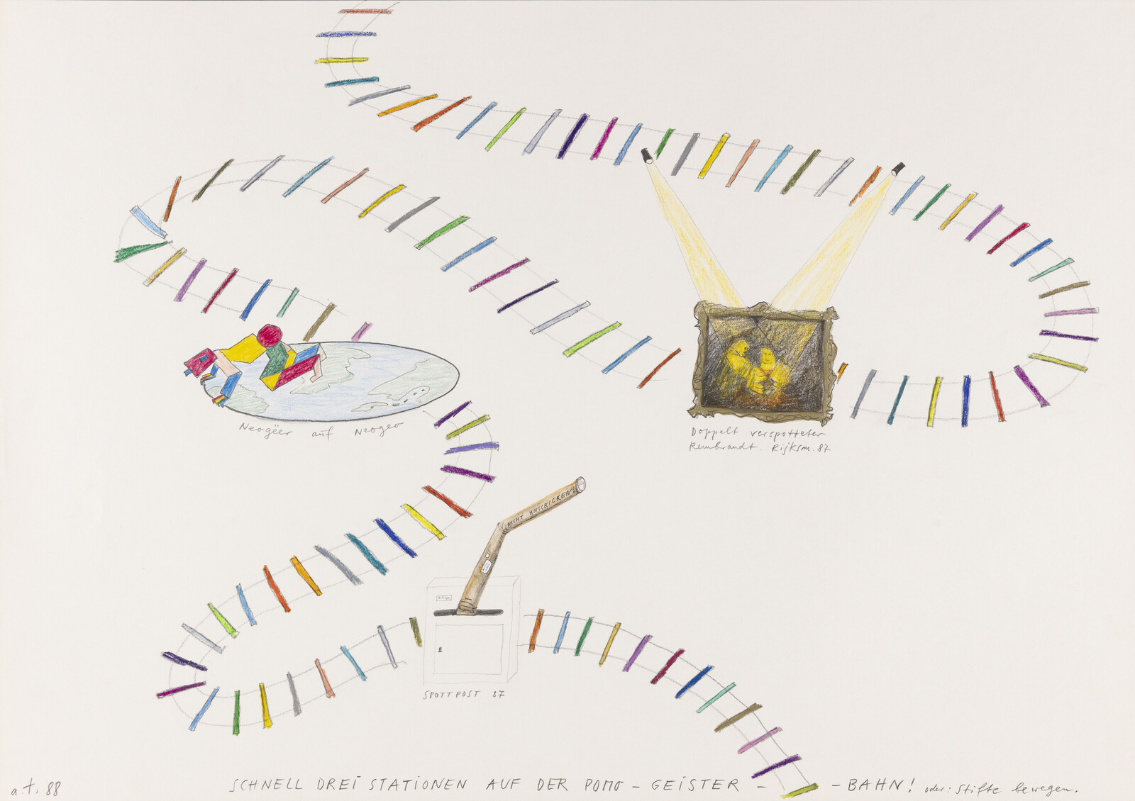 SCHNELL DREI STATIONEN AUF DER POMO-GEISTER-BAHN! oder: Stifte bewegen (Neogeer auf Neogeo/doppelt verspotteter Rembrandt Rijksmuseum 87/ Spott Post 87) 1988 43 x 61 cm Blei- und Buntstift