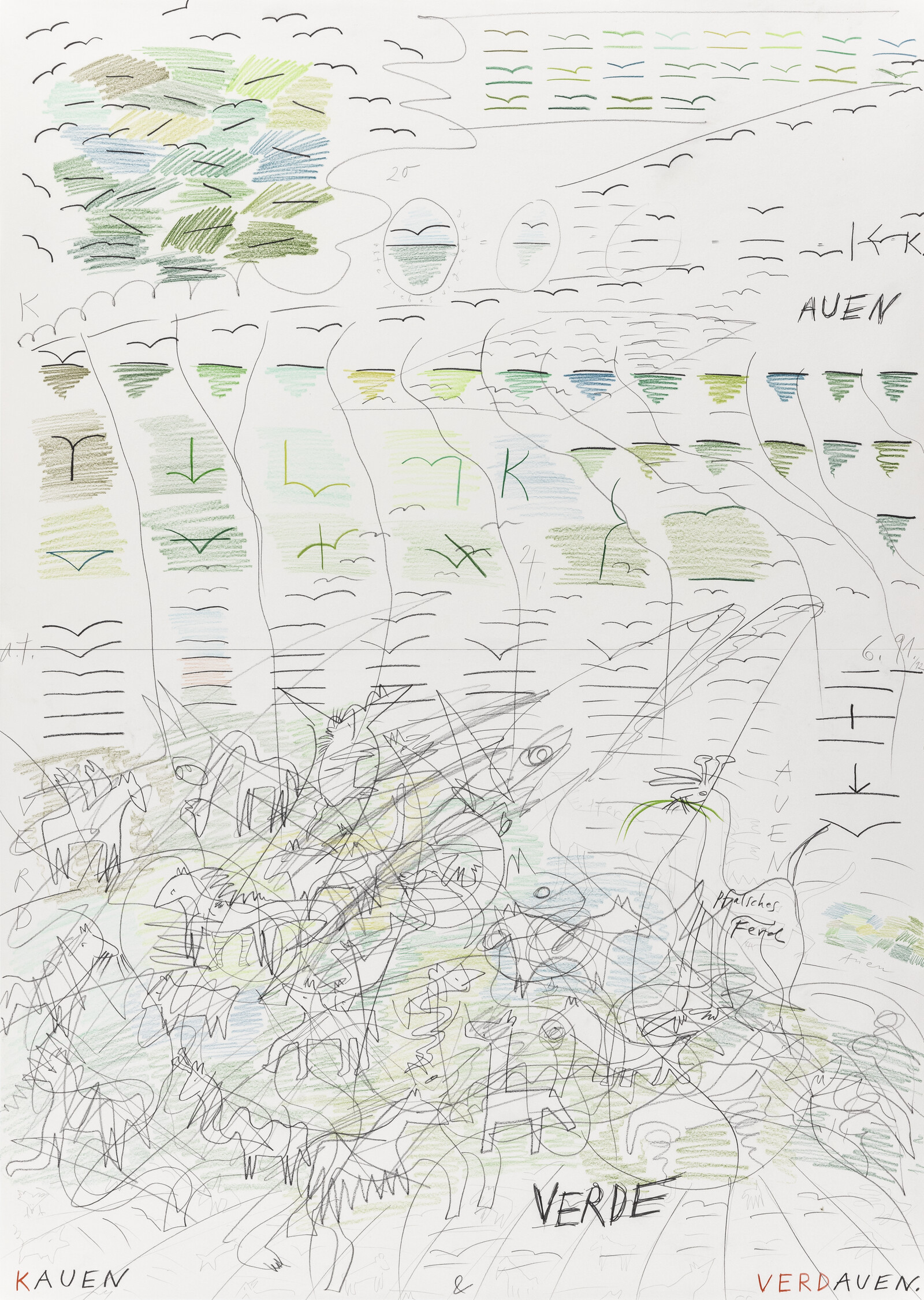 Bezaub‘ Naskanal - Bau Zahlbannakse! (Zahlen-Anagramm) 1991 43 x 61 cm Blei- und Buntstift